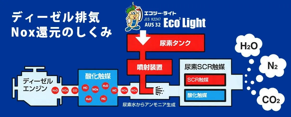 ディーゼルエンジンから排出される、大気汚染物質の窒素酸化物を分解して無害化する効果が期待できる、尿素水のエコツーライトを導入しており、正規販売代理店として導入に向けたご相談を承ります。尿素水の中から、マフラー詰まりの原因となりやすい物質を極力取り除いたため、安全に使用できます。運送事業を営む会社として、大気汚染を軽減に導く環境を考えた事業も展開しております。